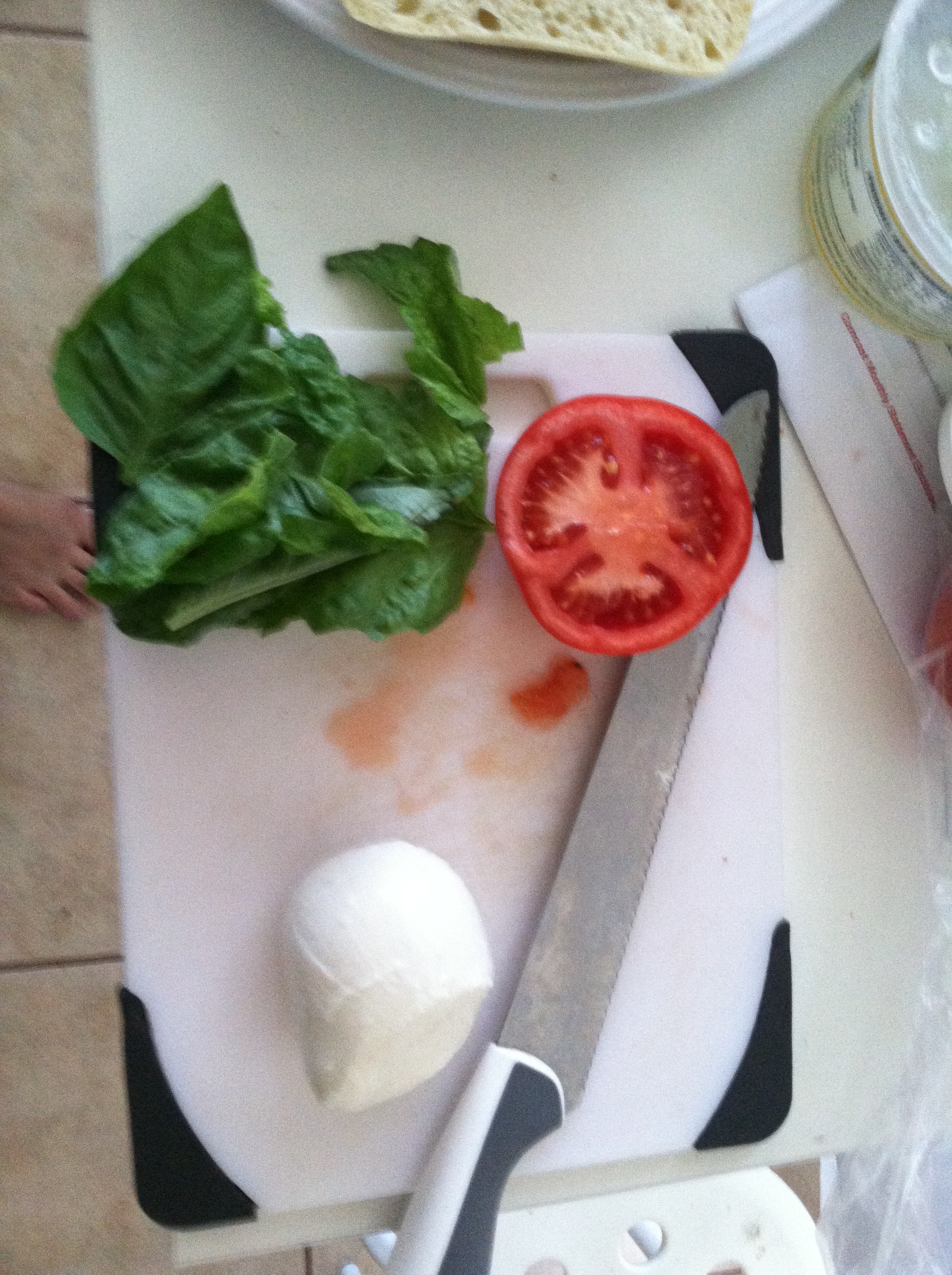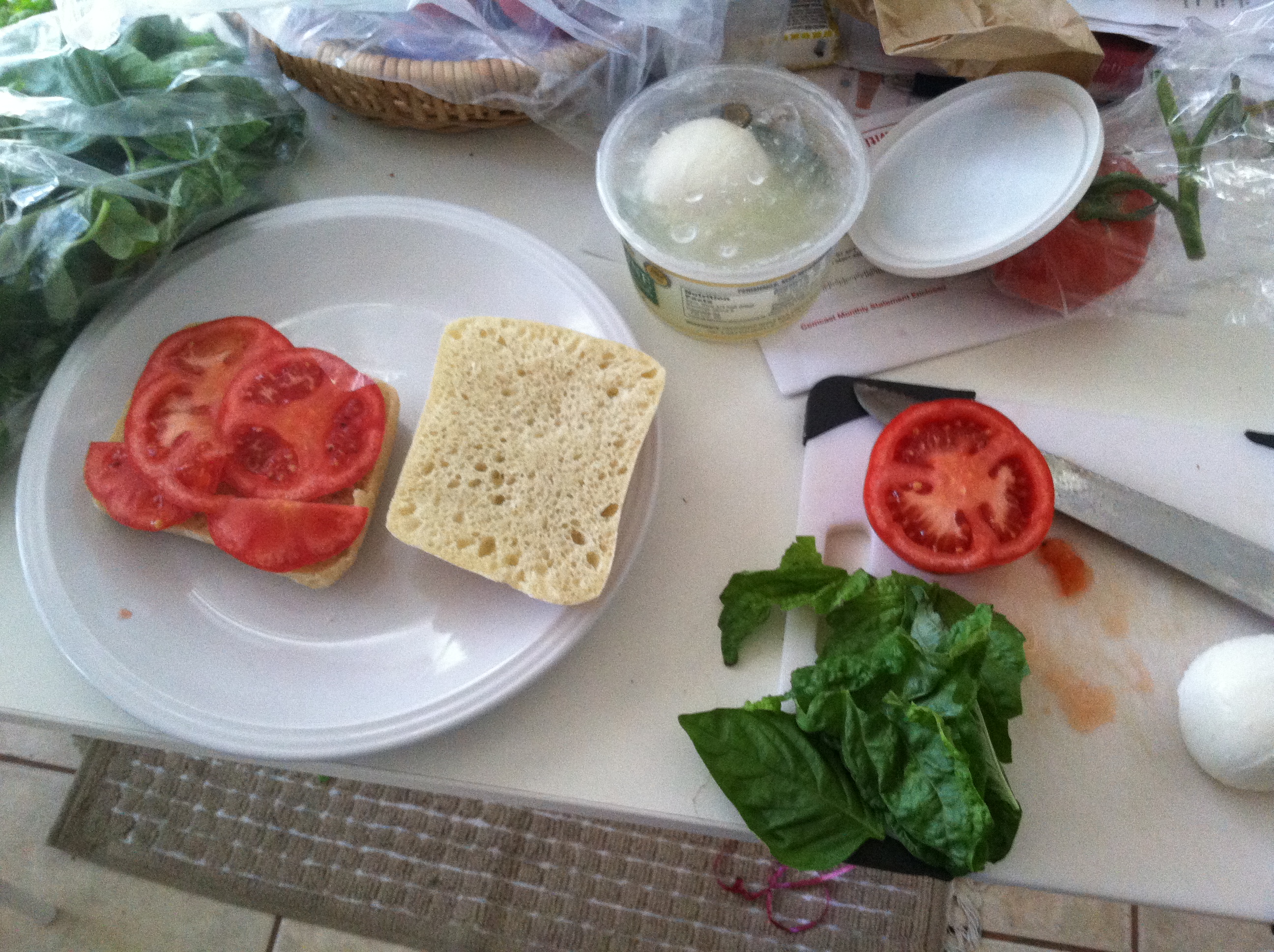 One of my favorite things to do on restless Sundays (as I’ve written about previously) is going to local farmer’s markets. Now that we’re approaching summer, I find myself earnestly looking forward to all the seasonal fruit at my favorite waterfront market in Oakland. This last run, I stocked up on stone fruit and some vine-ripened tomatoes. One thing that I can never pass up, however, are the big fragrant bunches of basil you can find for little over a dollar. Of course, I then have to think of new and creative ways to use said basil. My go-to is always a little Caprese salad, or, in this case, Caprese salad wedged in a fresh-baked ciabatta roll with a dollop of olive oil on the side for dipping. The perfect warm-weather meal, if you ask me.