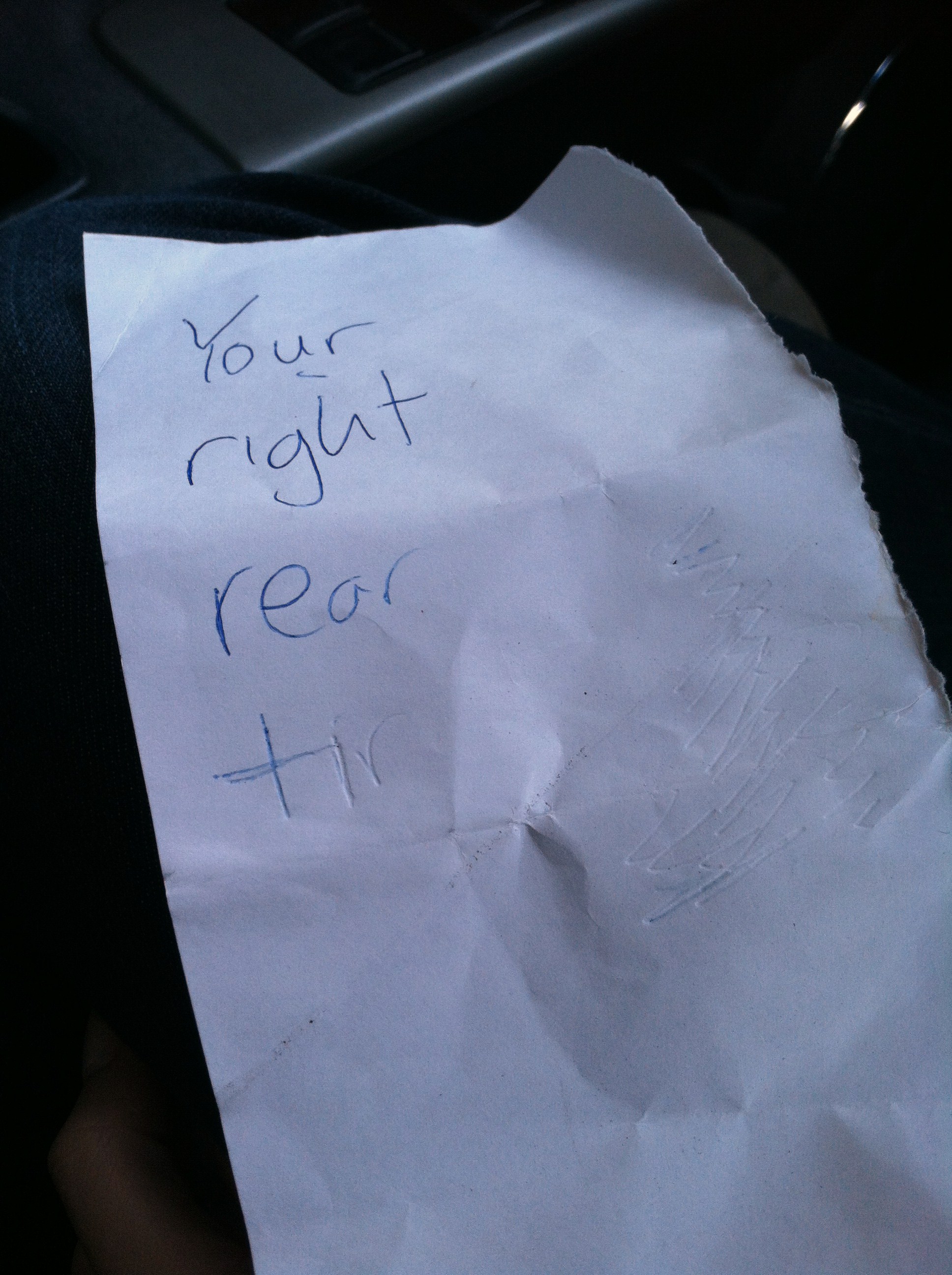 Sometimes, life gives you a flat tire just to show you that there are some decent people out there. If that person hadn’t made a little extra effort on their morning commute, I might have attempted to drive on without noticing my flat. I could have damaged my car, or even gotten into an accident on my way home. Thanks, whoever-you-are. Sorry about your pen.