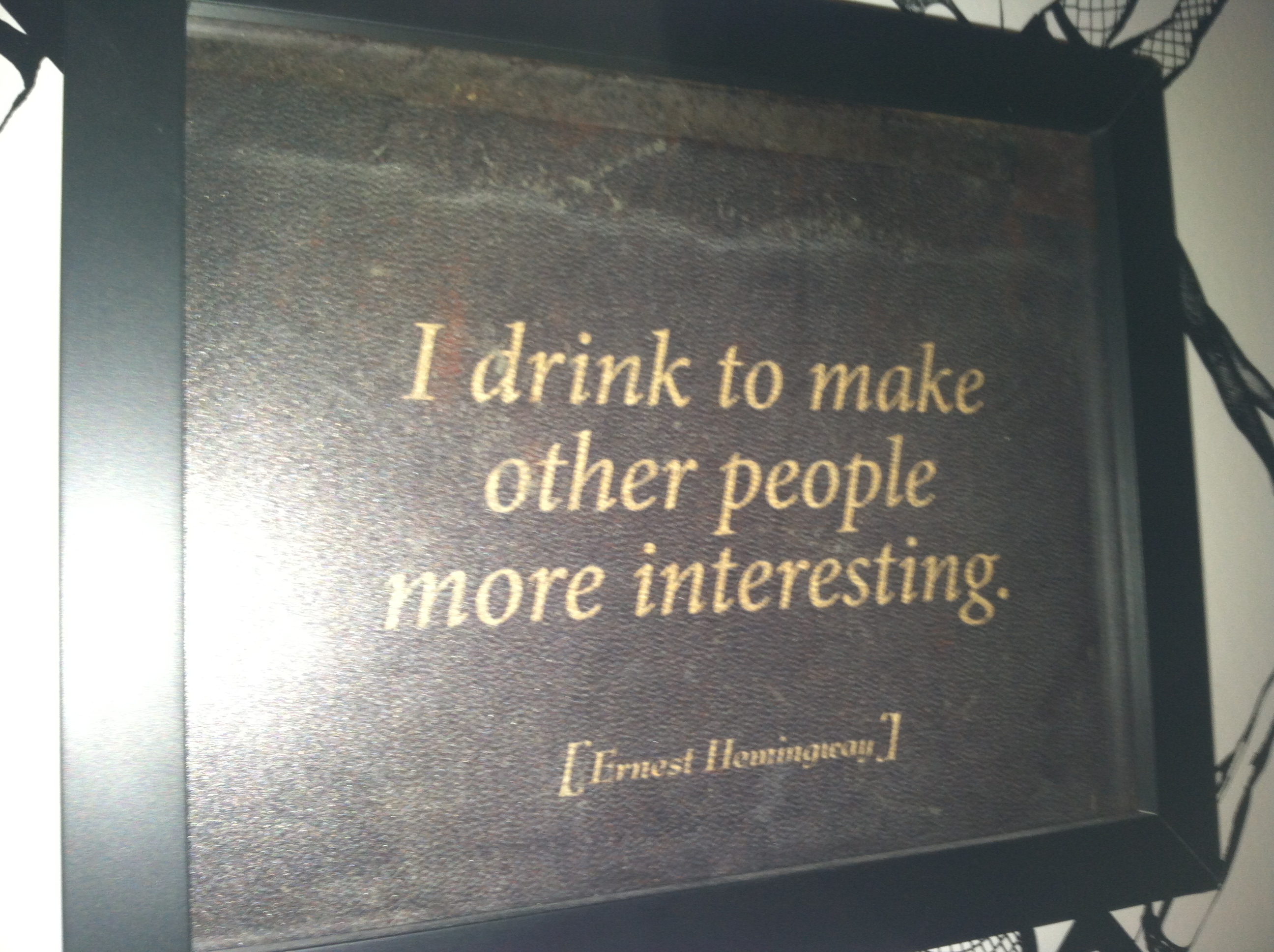 After an Atticus Finch and Leopold Bloom or two, I made the loop to the ladies room. I found it covered in fantastic, stockinged-leg printed wallpaper, and little gems of wisdom hanging from the walls. This was my favorite, and made me laugh out loud: